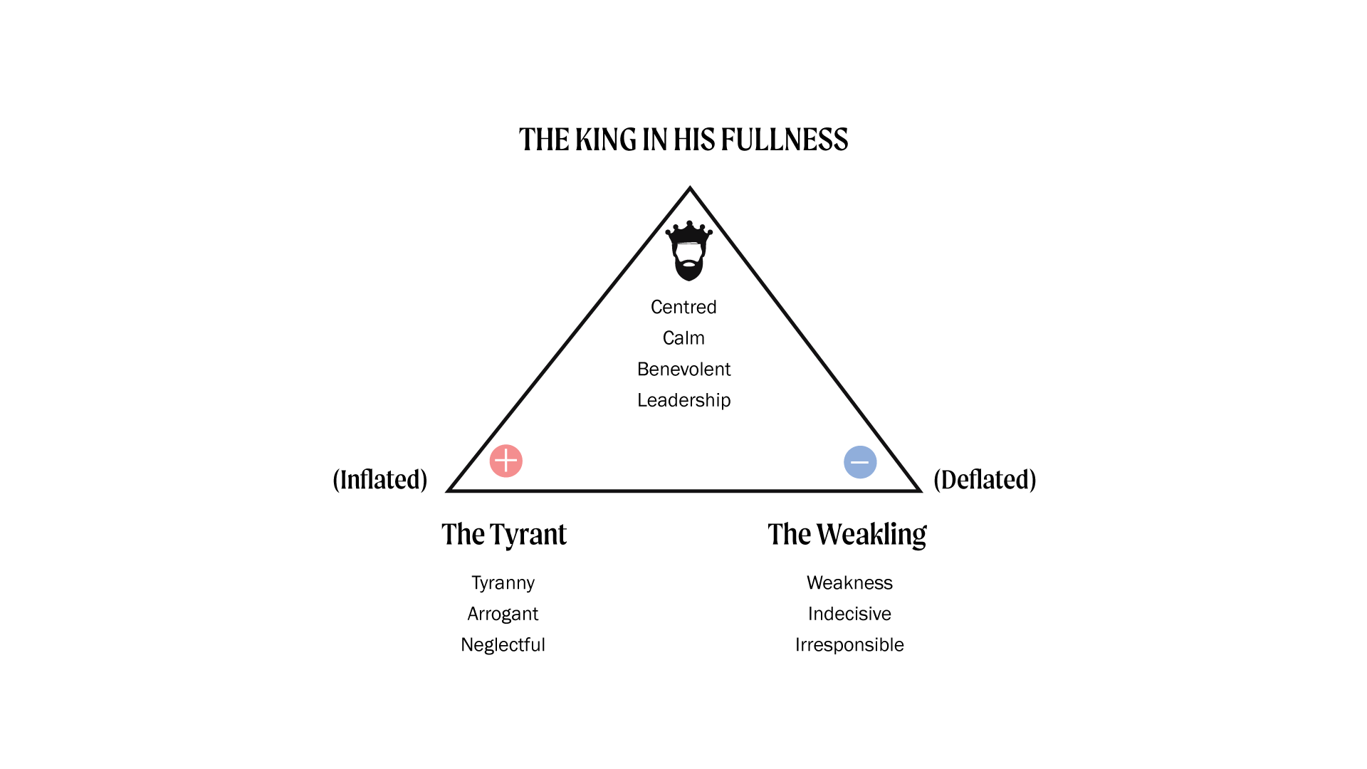 The tyrannical King emerges when a man identifies with the King archetype rather than relating to it consciously. Moore describes two forms of this usurpation: the active-independent (sociopathic/antisocial personality) and the passive-independent (narcissistic personality disorder). Both create chaos rather than cosmos, curse rather than bless, and cannot empower others.
